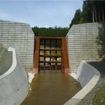 写真は広島県三次市作木町上作木に位置する便坂川で、経済性に優れる砂防ソイルセメント工法堰堤、住民に与える安心感が高いと考えられるコンクリートパネルなど、環境面にも配慮した設計を行っています。