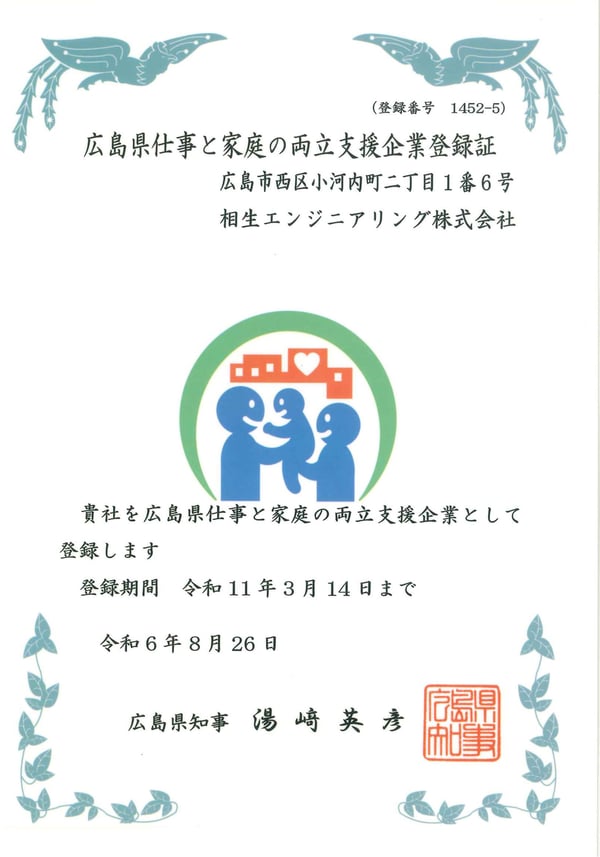 弊社が策定した行動計画が「仕事と家庭の両立支援」に取り組む企業として広島県に登録されました。